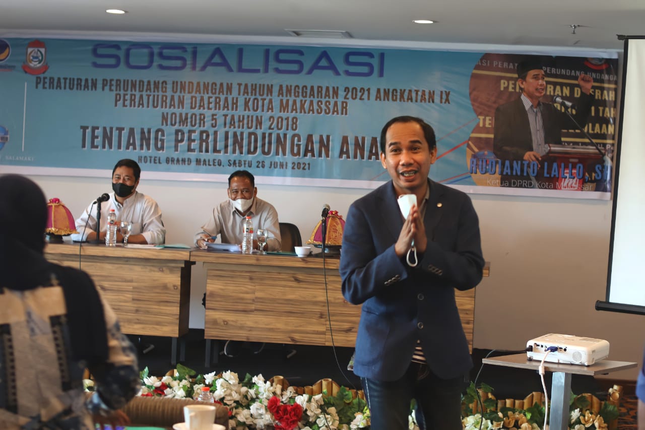 SULSELSATU.com MAKASSAR – Ketua DPRD Kota Makassar Rudianto Lallo (RL) melakukan Sosialisasi Peraturan Daerah (Perda) nomor 5 tahun 2018 Tentang Perlindungan Anak di hotel di hotel Grand Maleo Makassar, Sabtu, (26/06/2021).