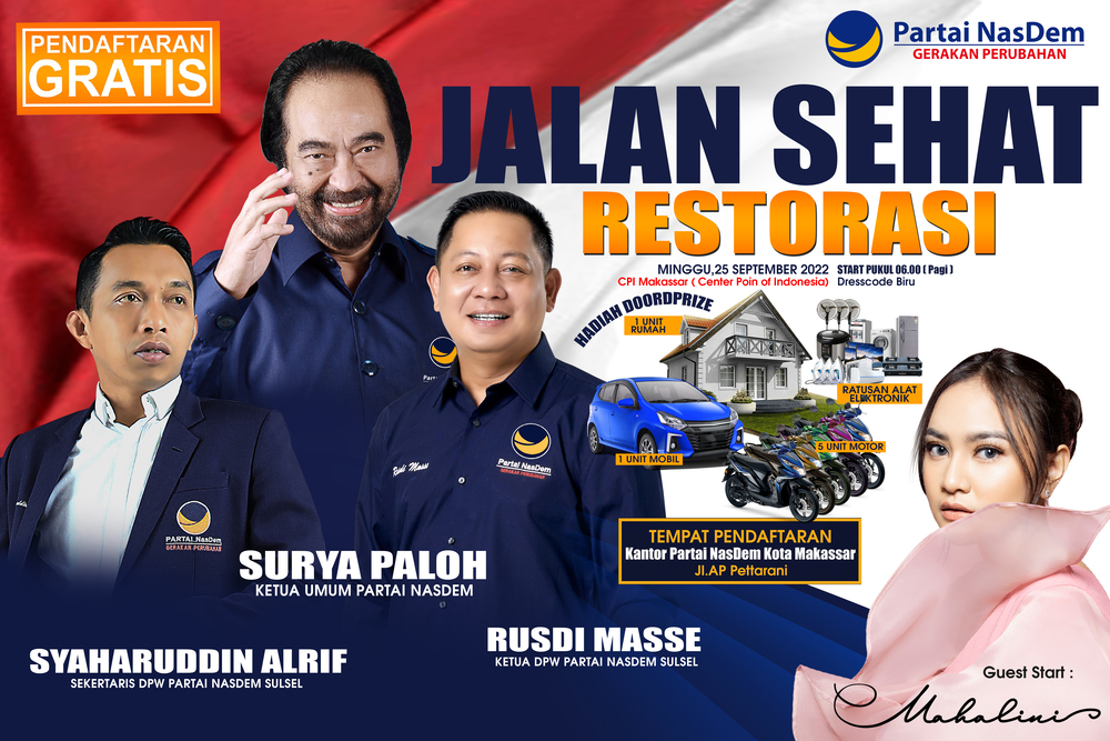 Diketahui, Jalan Sehat Restorasi NasDem Sulsel ini akan dihadiri Ketua Umum Partai NasDem, Surya Paloh. Sejumlah hadiah menarik juga telah disiapkan.