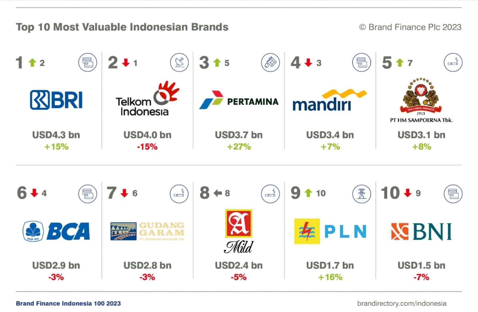 Adapun 10 brand paling bernilai di Indonesia atau ‘Top 10 Most Valuable Indonesia Brands’ versi Brand Finance 100 tahun 2023 secara berturut-turut adalah BRI, Telkom Indonesia, Pertamina, Mandiri, HM Sampoerna, BCA, Gudang Garam, A Mild, PLN dan BNI.