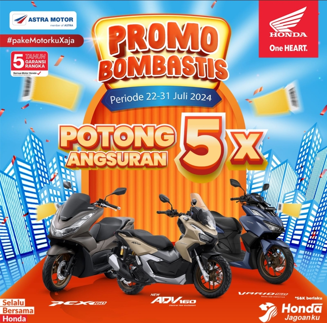 Promo Bombastis ketiga khusus untuk tipe Honda PCX 160, New ADV 160, dan Honda Vario 160. Ada potongan angsuran lima kali yang berlaku pada periode 22-31 Juki 2024.