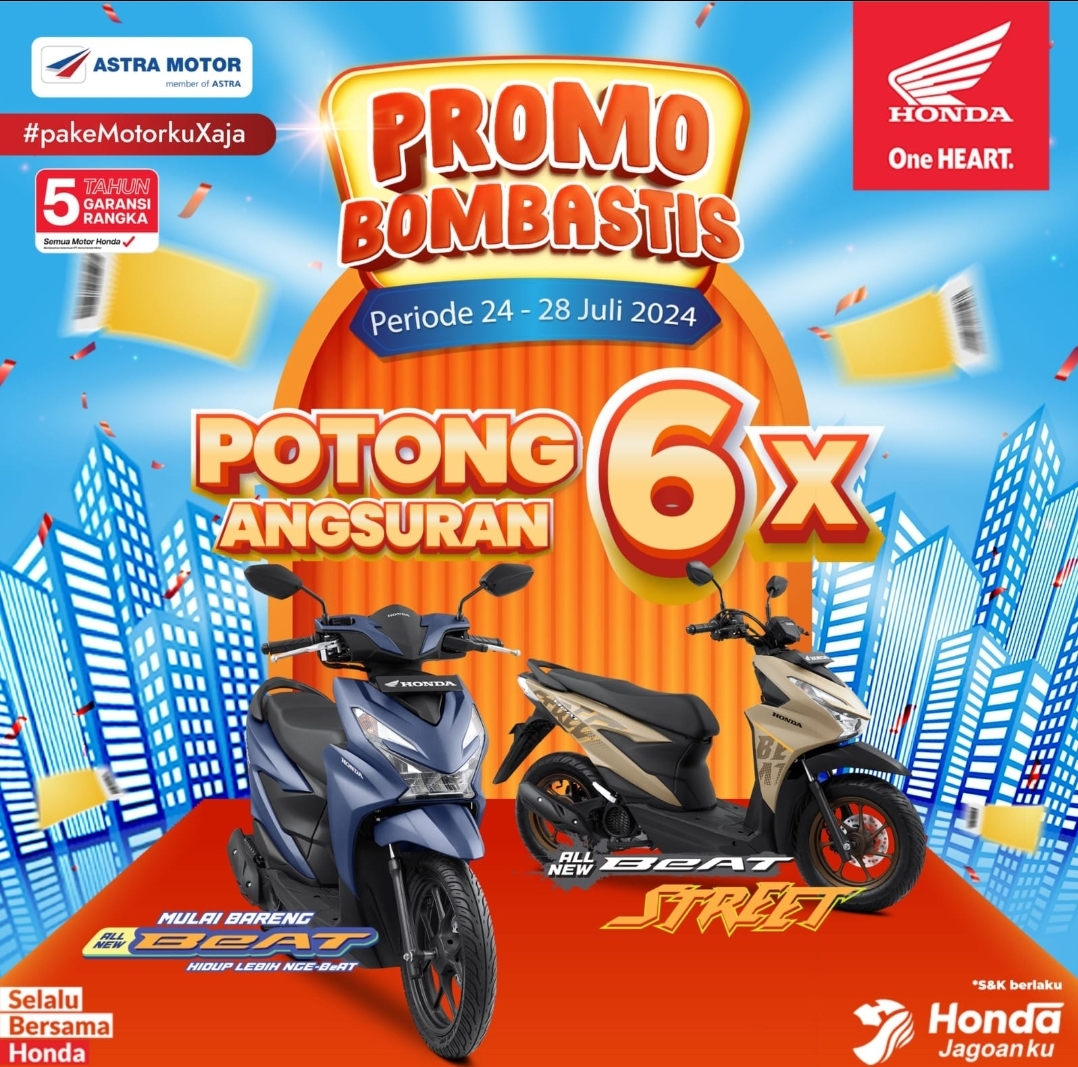 Kedua, ada promo Bombastis untuk tipe All New BeAT dan All New BeAT Street. Ada potongan angsuran sampai enam kali khusus periode 24-28 Juli 2024.