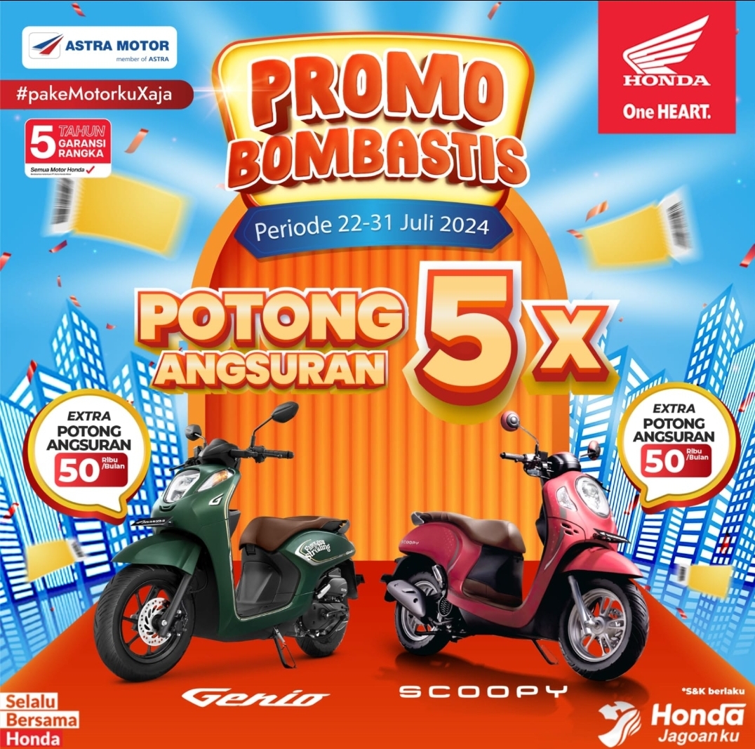 Promo Bombastis pertama khusus untuk tipe Honda Genio dan Honda Scoopy. Periodenya berlaku selama 22-31 Juli 2024.