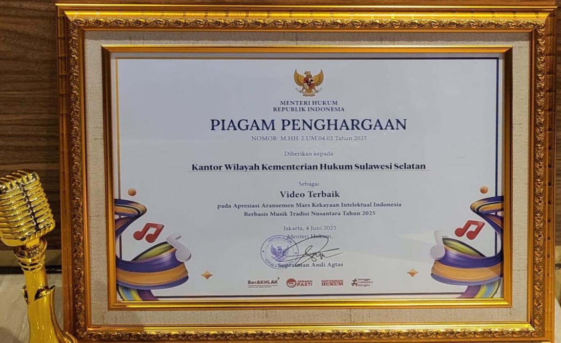 SULSELSATU.com, JAKARTA – Kantor Wilayah Kementerian Hukum Sulawesi Selatan (Kanwil Kemenkum Sulsel) menorehkan prestasi membanggakan dengan meraih penghargaan Video terbaik dalam lomba Aransemen Mars Kekayaan Intelektual Indonesia Berbasis Musik Tradisi Nusantara Tahun 2025.